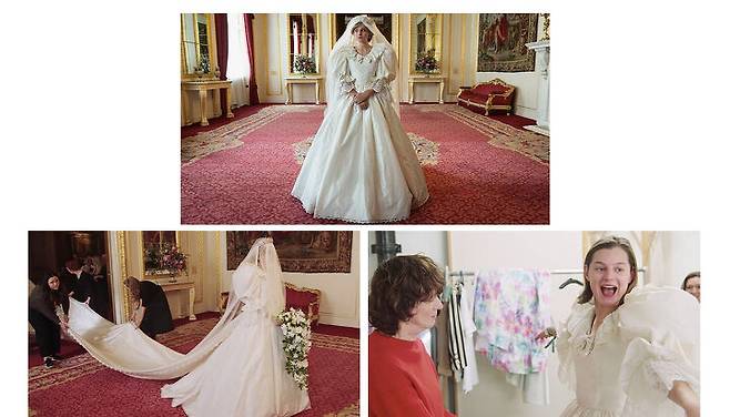 다이애나 비의 웨딩 드레스는 디자이너 에이미 로버츠에게 가장 어려운 작업이었다. 실제 그녀의 웨딩드레스를 디자인한 데이비드와 엘리자베스 엠마누엘을 만나 원본 스케치와 디자인에 대해 오랜 시간 논의했고, 그 결과 4주에 걸쳐 4명의 디자이너가 힘을 모아 무려 30m 길이의 다이애나 비 웨딩 드레스를 완벽하게 재현해냈다. 드레스를 장식한 레이스 역시 실제 사용됐던 노팅엄 회사에 제작을 요청했다.