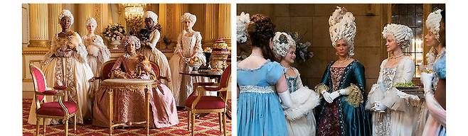 브리저튼의 파격적인 스토리 중 중요한 역할을 차지하는, 흑인 여왕 샬롯은 실존 인물이라는 추측이 강하게 드는 인물이다. 디자이너 엘른 미로즈닉은 시대를 초월하는 여왕의 스타일로 우아하면서도 강인하고 그녀에게 잘 어울릴만한 다채로운 컬러를 활용했다. 특히 가운에 장식된 트리밍과 헤어피스의 모양을 반복해 사용해서 드레스마다 달라지는 이색 헤어피스들을 찾아보는 재미가 쏠쏠하다.