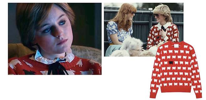 찰스 왕세자와 함께 폴로 경기를 관람했던 다이애나 비의 빨간 스웨터. 그저 귀엽기만 한 양 패턴처럼 보이지만 당시 하얀 양 무리 사이에 있는 검은 양 한 마리로 자신을 대변한 것 아니냐는 언론의 추측으로 뜨거운 관심을 받기도 했다. <더 크라운 시즌4>를 통해 등장한 그 화제의 빨간 스웨터가 다시금 주목받으며 영국과 미국의 의류 브랜드 ‘웜 앤 원더풀’과 ‘로잉 블레이저스’가 손을 잡고 26년만에 재출시했고 주문 폭주를 기록했다.