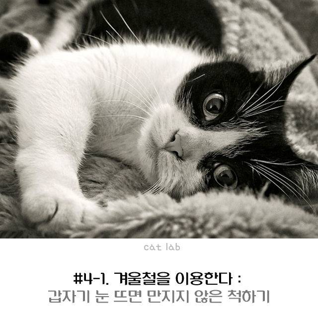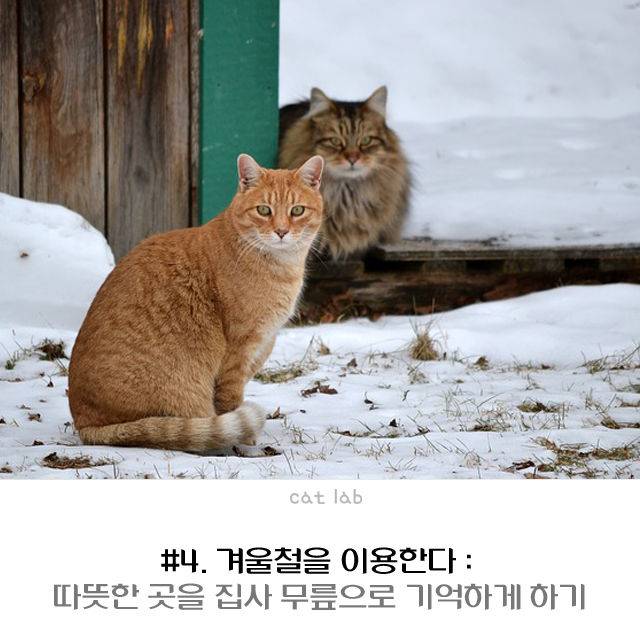 여름엔 시원한 장소를, 반대로 겨울엔 가장 따뜻한 장소를 찾아내는 데 탁월한 능력을 가진 고양이. 차가운 바닥 위보다 무릎 위에 있으면 따뜻하다는 것을 기억하면 자연스럽게 다가온다. 먼저 난방을 끄고 소파나 바닥에 앉아 기다린다. 따뜻한 곳에서 낮잠을 자고 싶어 진 고양이가 무릎 위로 올라오게 된다.