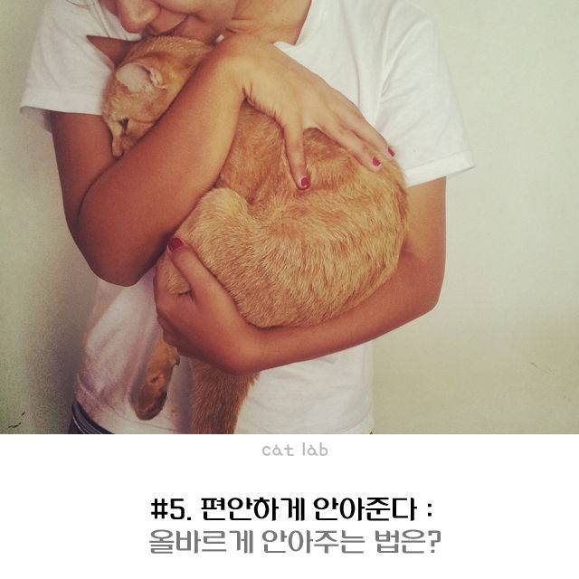 고양이의 앞발 겨드랑이에 손을 넣어 천천히 들어 올리면서 한 손으로 엉덩이를 지탱한다. 고양이의 몸을 감싸듯이 안아 집사의 몸에 밀착시키면 고양이는 안심하고 몸을 맡긴다.