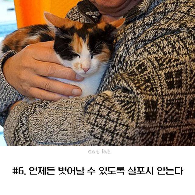 하지만 고양이는 변덕스러운 데다가 구속당하는 것을 싫어하는 동물이다. 자유롭게 집사의 팔에서 벗어날 수 있도록 힘을 꽉 주어 안지 말고 살포시 안아 주자.