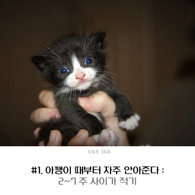 생후 2~7주는 고양이의 사회화 시기. 태어나서 2주일이 지나면 고양이는 주변 세계를 인식하며 환경에 적응해간다. 이때 안기는 버릇을 들여놓으면 집사가 안아도 싫어하지 않게 된다.