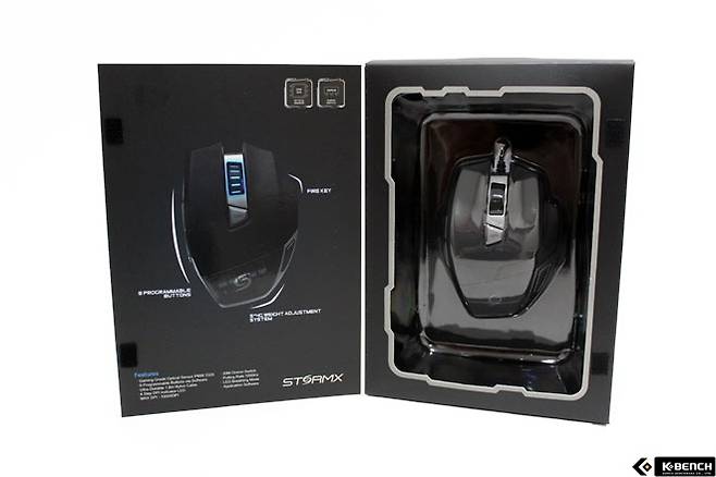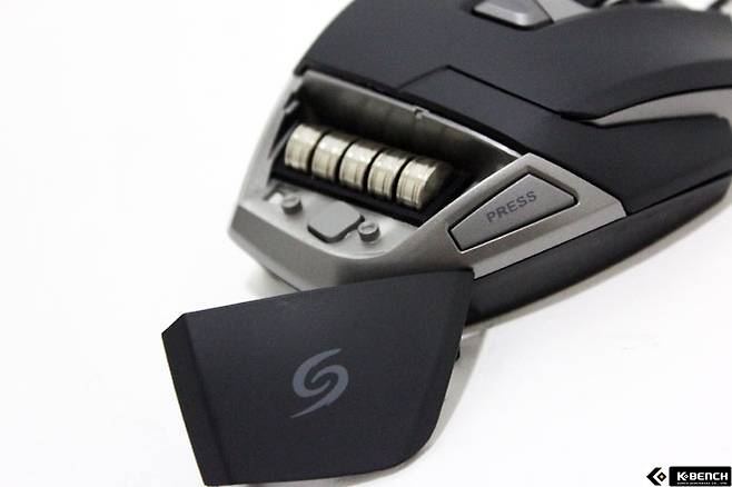 하지만 여러 사용자의 취향을 고려한 5g의 무게 조절 추를 5개 제공하고 있어 최대 120g의 무게로 설정해 사용할 수 있다. 무게 추는 마우스 뒷면에 'PRESS' 버튼을 누르면 무게 조절 추 수납 공간을 열 수 있으며, 사용자 취향에 맞게 장착할 수 있다.