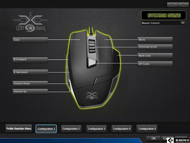 XENICS 홈페이지에서 제공하는 제닉스 스톰엑스 M2 SE 전용 소프트웨어를 사용한다면 윈도우 기본 마우스 옵션에서 건드리기 힘들었던 세세한 설정들을 만질 수 있다. 마스터 컨트롤 탭에서는 스톰엑스 M2 SE의 9가지 버튼을 사용자 취향대로 바꿀 수 있고 5가지 프로파일을 통해 필요한 설정별로 저장할 수도 있다.