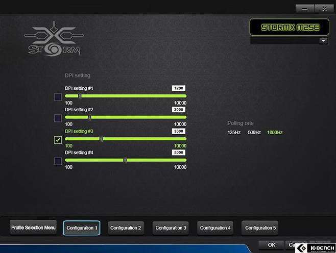 DPI 세팅 탭에서는 4가지 DPI 설정 값을 저장할 수 있고 Polling rate 전송제어 방식을 설정할 수 있다. DPI는 최대 10,000 DPI까지 선택할 수 있으며, Polling rate는 125Hz, 500Hz, 1000Hz 등으로 변경할 수 있다. 만약 FPS 게임을 즐겨하는 사용자라면 반응속도와 부드러움이 높은 Polling rate 값으로 설정하는 것이 좋을듯 하다.