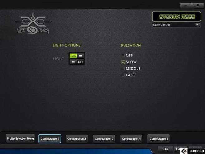마지막으로 컬러 컨트롤 탭에서는 제닉스 스톰엑스 M2 SE 게이밍 마우스에서 제공하는 블루 LED의 ON, OFF 유무를 설정할 수 있으며, 숨쉬기 효과 모드를 제거하거나 숨쉬기 모드의 조명 속도를 설정할 수 있도록 구성되어 있다.