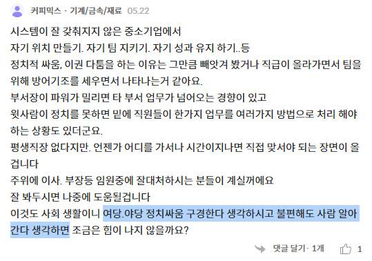 “주위에 이사, 부장 등 임원중에 잘 대처하시는 분들이 계실거에요. 잘 봐두시면 나중에 도움될겁니다. 이것도 사회 생활이니 여당 야당 정치싸움 구경한다 생각하시고 불편해도 사람 알아간다 생각하면 조금은 힘이 나지 않을까요?” (커피믹스 · 기계/금속/재료)