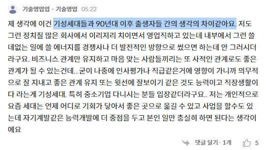 “사람들과 좋은 관계 유지하고 윗선에 잘보이기 같은 것도 능력이고 직장생활이다 라는게 기성세대, 특히 중소기업 다니시는 분들 입장 같더라구요.. 저는 개인적으로 요즘 세대는 언제 어디로 기회가 닿아서 좋은 곳으로 옮길 수 있고 사업을 할 수도 있는데 자기계발같은 능력개발에 더 중점을 두고 본인 일만 충실히 하면 된다는 생각이에요. (기술영업업 · 기술영업)”
