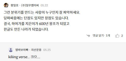 “그런(당파싸움) 분위기를 만드는 사람이 누구인지 잘 파악하세요. 당파싸움에는 단점도 있지만 장점도 있습니다. 결국, 하여가를 지은이가 600년 왕조가 되었고 한글도 만든 나라가 되었듯이요.” (황일호 · (주)일우엠이씨)