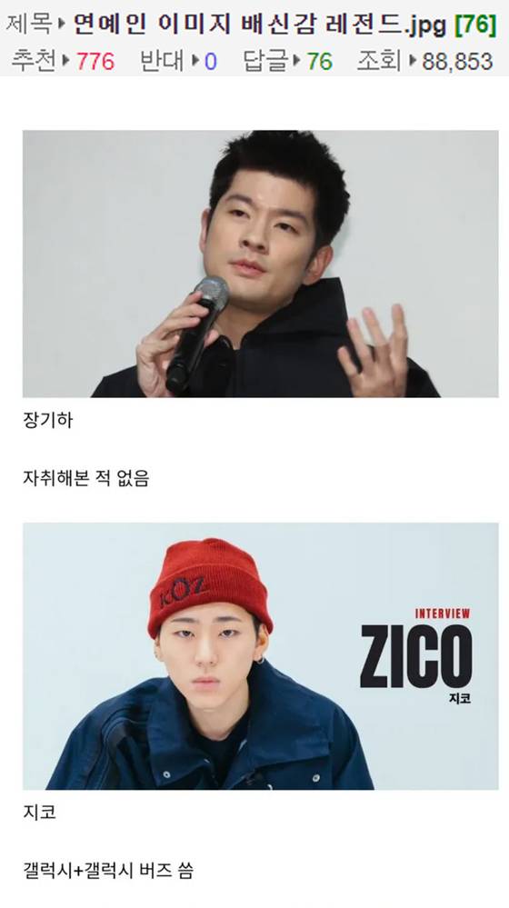 연예인 만큼 이미지가 중요한 직업이 있을까. 한 커뮤니티에서 연예인 이미지 배신감 레전드에 관한 글이 화제가 되었다. 글의 주인공이 된 연예인은 장기하, 지코, 김국진, 김상중, 이성민, 김희원, 박성웅, 지효, 김다미, 최다니엘, 송강호로 총 11명이다. 장기하는 ‘싸구려 커피’라는 곡으로 구질구질한 자취방에 살아본 경험에 관한 곡을 작사, 작곡했다. 하지만 실제로는 자취를 해본 적이 한 번도 없다고 한다. 이에 많은 이들은 “장기하는 옥탑방에서 골골대면서 기타치고 자기 밴드 애들이랑 술 파티 자주는 아니고 가끔 하면서 장판도 잘 갈 거 같은 이미지였는데…”, “심지어 그냥 자취 안 해본 게 아니라 유복한 집안 출신에 서울대 나온 엘리트임ㅋㅋㅋ”, “이젠 자취도 빼앗아가네…”라는 말을 전했다.