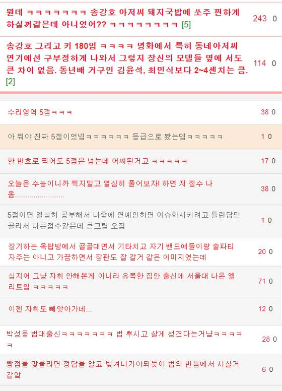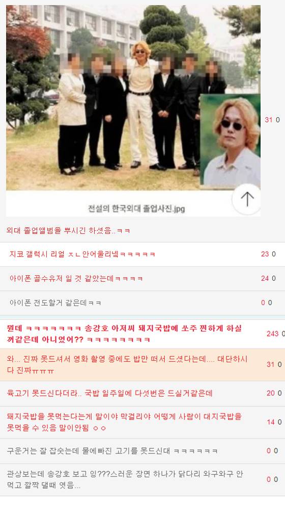 그 외에도 지코는 아이폰을 쓰며 전도할 것 같은 이미지 같지만 실제로는 갤럭시+갤럭시 버즈를 사용한다는 사실, 개그맨 김국진은 실제로는 안경알이 없는 안경을 낀다는 사실, 김상중, 이성민, 김희원은 술 한잔도 못 마신다는 사실 등이 이 글을 접한 많은 이들에게 배신감을 안겨줬다. 하지만 이러한 감정을 느끼게 했다는 건 그만큼 자신의 분야에 몰입하고, 집중했다는 게 아닐까. 배우 송강호는 여러 영화에서 돼지국밥에 소주 한잔 진하게 하는 연기를 선보였다. 이러한 장면을 접한 동시에 새로운 사실을 알게 된 이들은 “실제 주위에서 볼 수 있는 동네 아저씨를 보는 것 같았다”, “송강호 아저씨 돼지국밥에 소주 찐하게 하실 거 같은데 아니었어?ㅋㅋㅋ”라는 반응을 보였다.