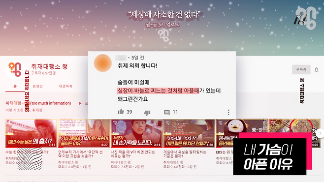 한 구독자가 유튜브 댓글로 “숨 들여 마실 때 심장이 바늘로 찌르는 것처럼 아플 때가 있는데 왜 그런 건지 알아봐 달라”고 의뢰를 해주셨다.