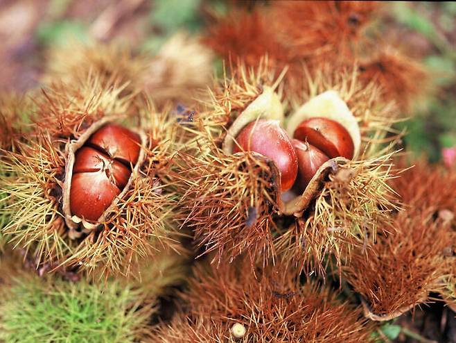 밤은 가을 햇살을 받아 토실토실 속이 꽉 차서 가을에 먹으면 맛있는데요. 밤은 나무에서 밤송이를 따서 수확하는 것 같지만, 잘 익으면 한 개씩 바닥에 톡톡 떨어진다고 해요. 떨어진 밤을 벌려서 탱글탱글한 밤을 주워요.