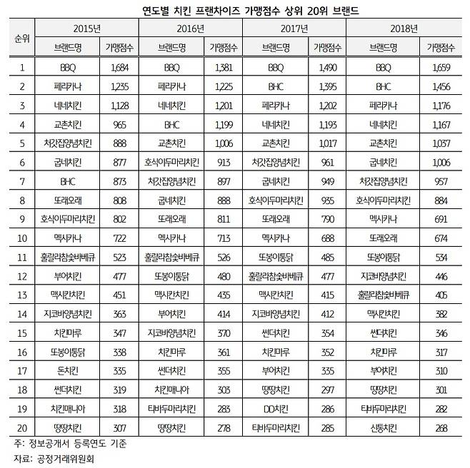 공정거래위원회가 발표한 2019년 치킨 프랜차이즈 가맹점수 상위 브랜드 자료를 보면 가맹점수 1000개 이상 치킨 브랜드는 7곳이다. BBQ가 1636개로 1위를 수성하고 있고, bhc가 1469개로 뒤쫓고 있다. 2017년 말 기준 100개 이내로 간극이 좁혀졌다가 다시 벌어진 상황이다.