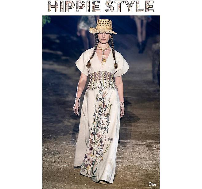 70년대를 풍미한 히피 룩은 시간이 흘러도 많은 사랑 받는 스타일 중 하나다. 히피의 상징, 타이 다이 염색은 티셔츠, 버킷 해트, 스윔웨어 등에 다양하게 활용되며 여름철을 대표하는 패턴으로 자리매김했다. 봄철 스타일링으로는 에스닉한 무드의 보헤미안 드레스가 제격이다. 다채로운 컬러와 섬세한 자수 장식이 화사함과 여성스러움을 자아내기 때문이다. 보헤미안 드레스는 보통 맥시 기장의 풍성한 형태로, 직선적인 디자인이나 도시적인 무드의 액세서리보다 유연한 실루엣과 내추럴한 무드의 아이템이 잘 어울린다.