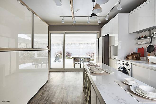 다목적 공간(Multi purpose Space) 활용 _ 아파트 13평과 주택의 13평은 그 쓰임과 활용이 전혀 다르다. 주택의 경우 외부 공간을 이용하여 내부 공간의 확장성을 꾀할 수 있기 때문에 아파트보다 훨씬 더 넓은 면적을 생활공간으로 활용할 수 있게 된다. 파주 집의 거실 앞 퍼걸러 공간은 또 다른 거실의 연장선이자 다양한 목적을 띤 공간이 된다. 현관문 옆의 조그만 포켓 테라스도 면적에는 들어가지 않지만, 주방을 위한 다용도 공간으로 활용할 수 있다. 민선이 방의 옆 외부 공간도 동일한 개념으로 진행됐다.