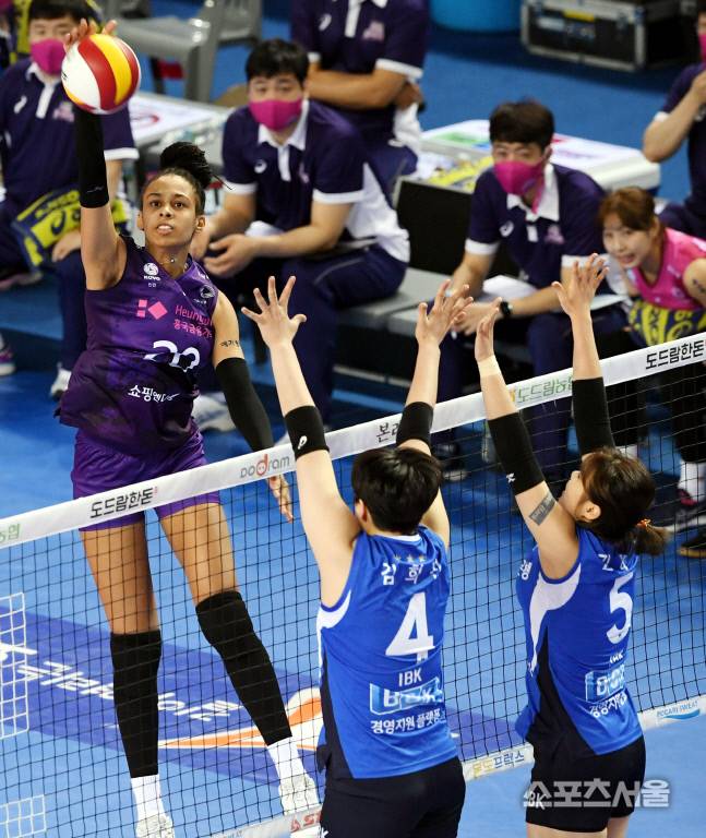흥국생명 브루나가 22일 경기도 화성종합실내체육관에서 진행된 IBK기업은행과의 플레이오프 2차전에서 강타로 공격하고있다. 2021.03.22. 김도훈기자 dica@sportsseoul.com