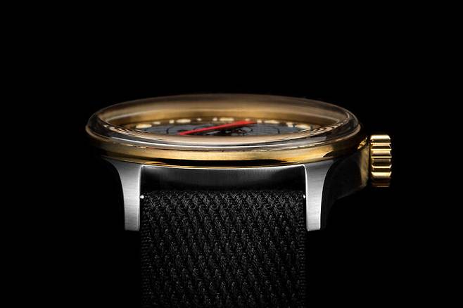 케이스 지름은 42mm, 두께는 11.2mm입니다. 이 모델은 스테인리스 스틸을 기본으로 베젤과 크라운에 브론즈를 사용해 두 소재의 다름을 즐기도록 했습니다. 시간의 흐름과 사용의 흔적을 가능한 한 남기지 않으려는 스테인리스 스틸과 반대로 ‘파티나(Patina)’를 통해 흔적을 남기려는 브론즈의 대비를 하나의 시계에서 지켜보는 일은 즐겁습니다. 두 소재 공통으로 헤어라인 위주의 표면 처리를 해 전체적으로 차분함이 감돕니다. 케이스 디자인에서 베젤은 폭이 좁고 돔 글라스가 차지하는 지분이 커 존재감이 크지 않습니다. 돔 글라스는 측면 시야에서 왜곡을 낳지만 빈티지 느낌을 연출하는 데에 이만한 게 없습니다. 러그는 정면에서 보면 길고 날렵합니다. 러그 모서리는 날카로운 칼로 순식간에 베어낸 듯, 잘려나간 단면이 미끈한 곡선을 그립니다. 케이스 측면은 심플하지만 돔 글라스가 크게 활약합니다. 볼록하게 솟아 오른 글라스의 매끄러운 라인이 케이스 실루엣에 재미를 줍니다. 1858 컬렉션에 공통으로 적용한 인그레이빙 케이스 백은 1858 24H에도 사용했습니다. 견고한 솔리드 백에 몽블랑 산과 주제를 새겨 무브먼트를 볼 수 없는 아쉬움을 달랩니다.
