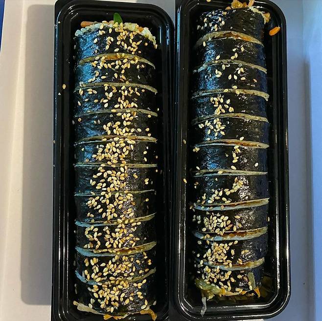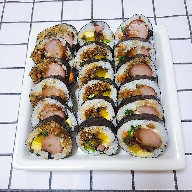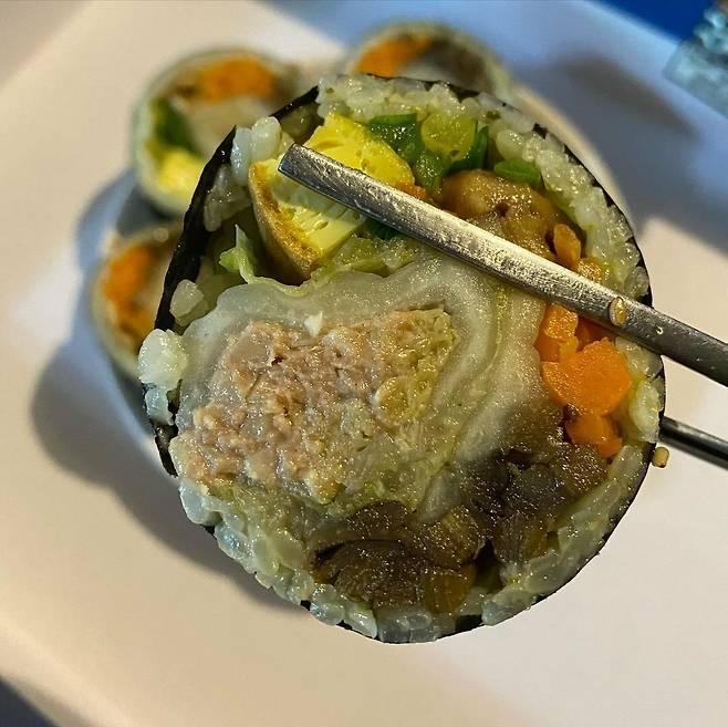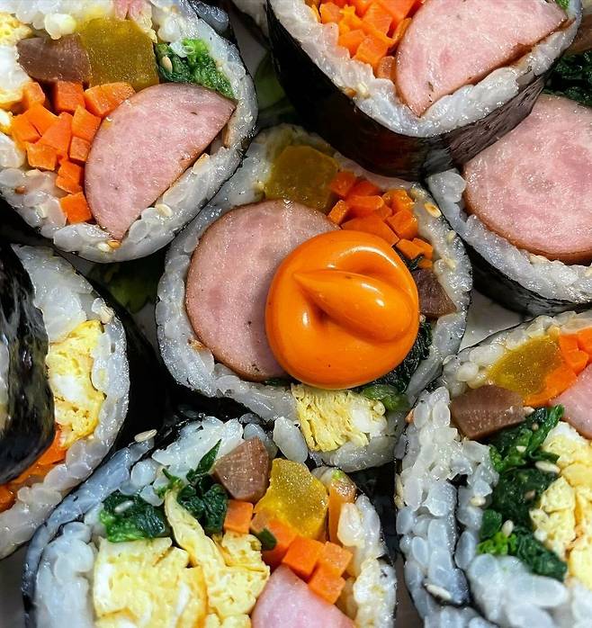 이 김밥에는 커다랗고 매콤한 소시지가 들어가 있답니다. 매콤한 소시지는 고소하고 달달 짭짤한 소스와 어우러지는 궁합이 최고래요. 중독성 강한 맛에 직접 집에서 시도해보시는 멋진 분들도 계시군요?!?! bb