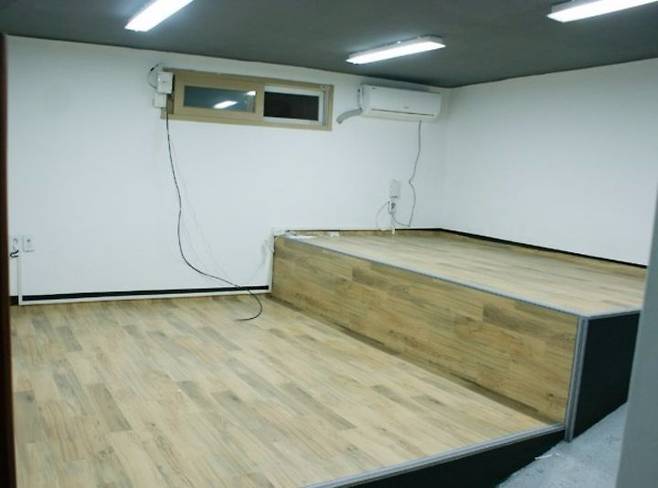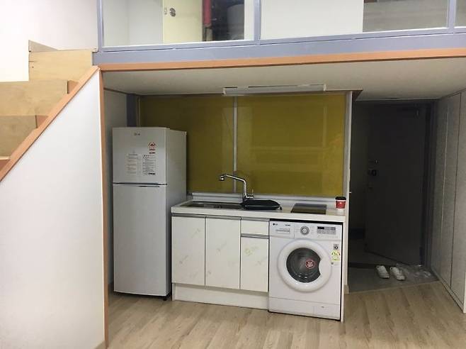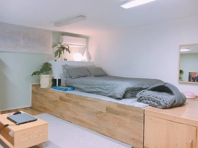 원룸 보증금을 빼서 차린 스튜디오다 보니 제가 지낼 곳도 여기에 만들어야 했어요. 그래서 스튜디오 문을 열면 나오는 짧은 복도를 지나 한 켠에 위치한 반지하 공간을 리모델링 했어요. 페인트 칠도 하고, 한 층 올라가 있는 부분은 각목과 판재로 확장 작업하고, 찬넬 선반도 달아서 잠 잘 곳을 마련했죠.
