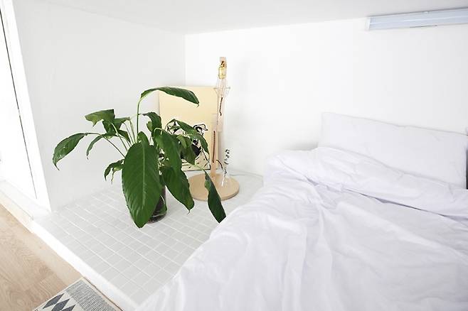 침대 옆 화분이 올려진 부분은 모자이크 타일로 마감을 했는데요, 원래 이 공간이 꽉 막힌 벽으로 죽은 공간이어서 제가 직접 망치로 다 때려 부수고 새로 만든 공간이에요.