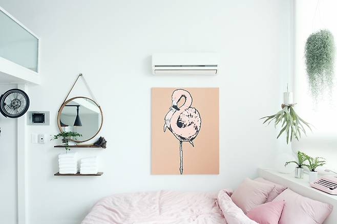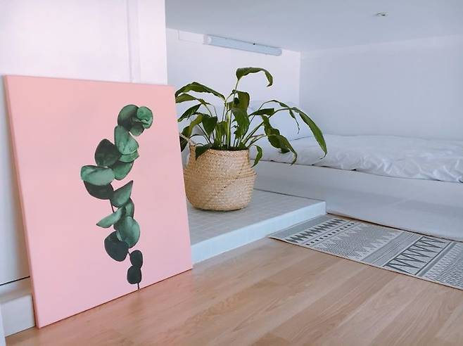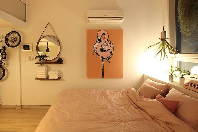 중앙의 그림은 제가 직접 그린 그림인데, 침구와 플라밍고가 핑크색이다 보니 배경은 조금 톤 다운 된 컬러를 사용했는데 잘 어울리는 것 같아요.