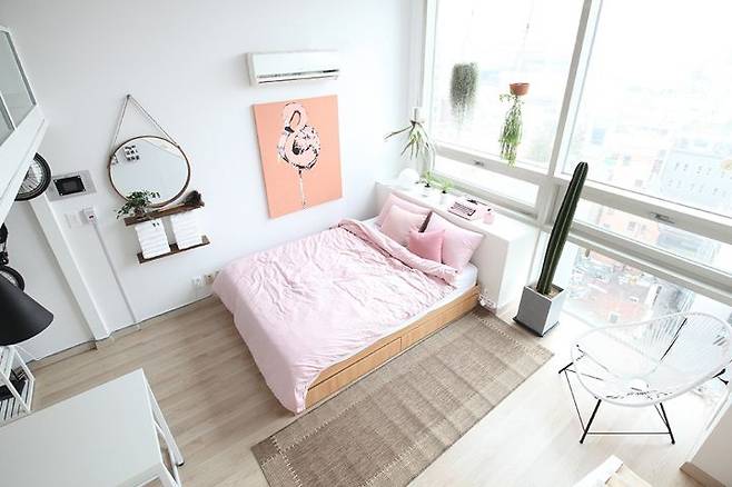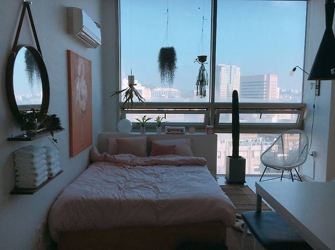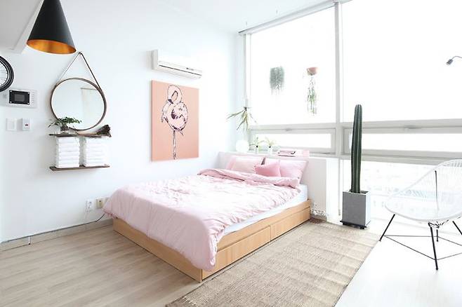 스트랩 거울 아래에는 선반을 달아서 수납공간을 확보했어요. 그리고 전체적으로 공간이 화사해보였으면 하는 마음에 침구는 핑크색으로 했어요. (남자라면 핑크죠! 허허)