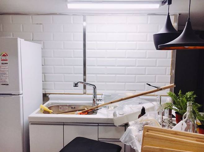 주방은 새로 시공해주셔서 말끔한 편이었는데 노랑노랑한 유리는 볼 때마다 슬플 것 같아서 폼타일을 붙여줬어요.