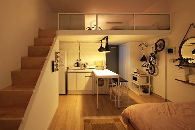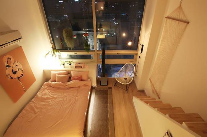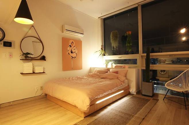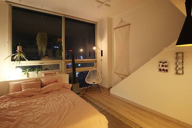 복층이 층고가 낮아서 생각보다 활용도가 좋진 않았어요. 그래서 침구를 하나 더 놓고 세번째 공간을 찾아온 손님이 잘 수 있는 게스트 공간으로 만들었어요. 제게도, 놀러온 친구들에게도 호텔에 놀러와서 쉬는 기분을 주고 싶었거든요.