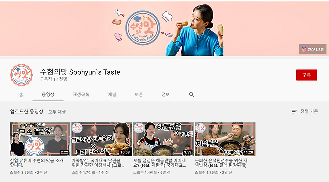 레시피 문의가 쇄도하자 김수현은 유튜브 채널 '수현의 맛'을 개설해 자신만의 레시피를 공개하고 있다.