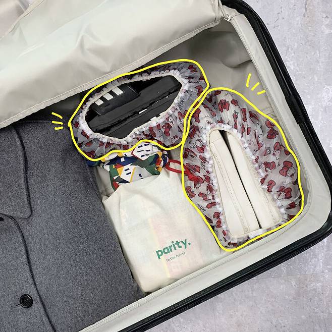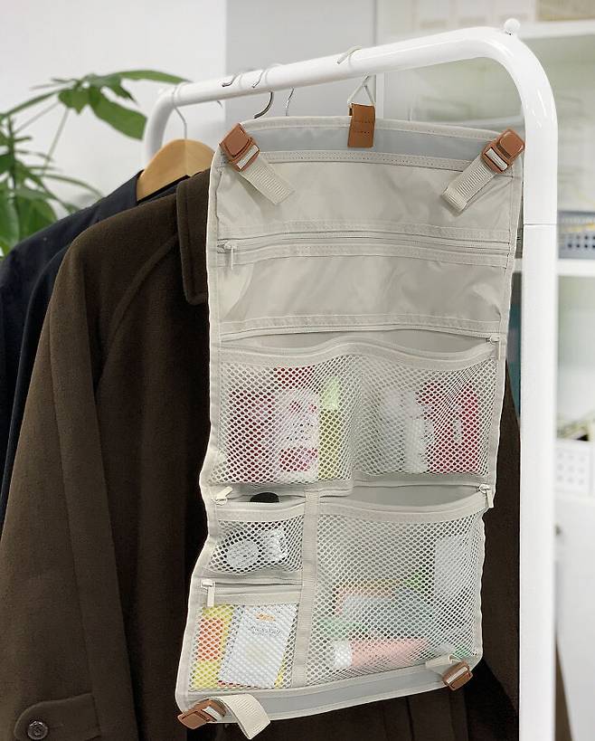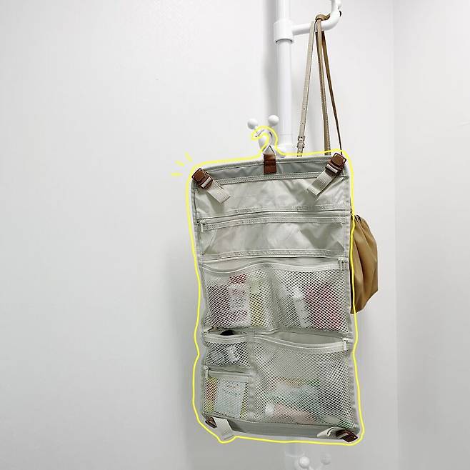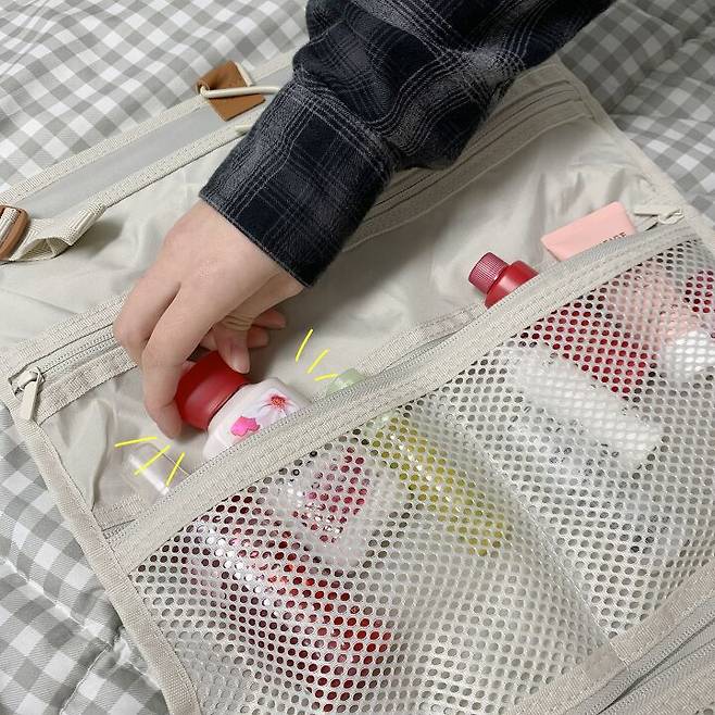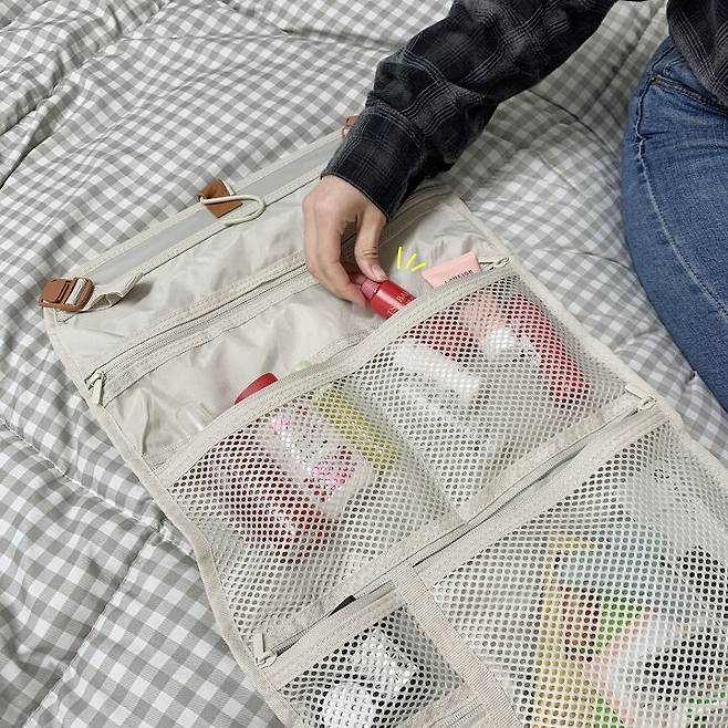 짐 챙길 때 파우치를 활용해보세요. 깔끔하게 정리할 수 있고 물건 섞일 위험도 없어요. 여러 사이즈가 있는 파우치 세트를 구매하거나 탈부착 포켓이 있는 캐리어를 사용해보세요. 저는 주로 워시 백을 이용하는 데 정말 편해요. 넉넉하게 세안 용품을 챙길 수 있고, 굳이 짐을 풀지 않아도 벽에 걸어 놓고 쓸 수 있거든요. 활용도 갑이죠? 아 한 가지 팁을 더 드리면, 신발의 밑창을 샤워캡으로 감싸서 가져가면 깨끗하게 보관할 수 있답니다.