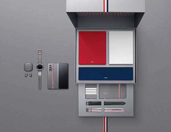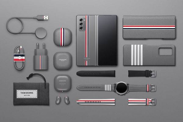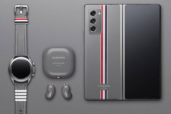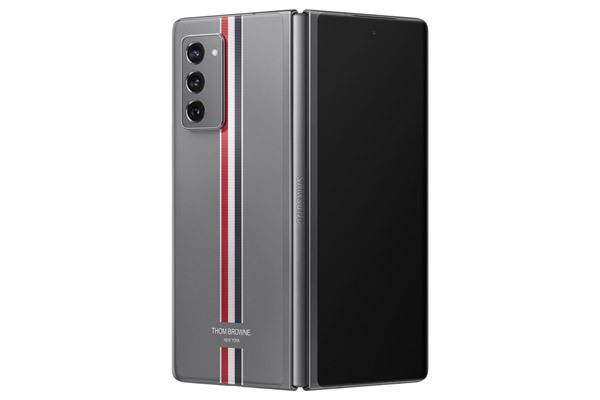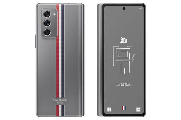 '갤럭시 Z 폴드2 톰브라운 에디션'은 톰브라운의 시그니처 회색 색상에 브랜드 고유의 빨간색, 흰색, 파란색 패턴을 섬유 소재로 입체적으로 적용했다.