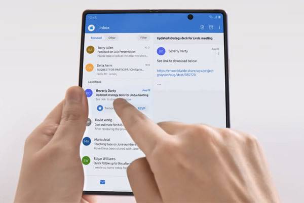 갤럭시 Z 폴드2는 7.6형 대화면에 최적화된 화면 디자인을 지원하며 유투브(YouTube)·지메일(Gmail)·마이크로소프트365등 주요 앱에서 사용할 수 있다. 목록과 세부 정보를 한눈에 확인할 수 있고, 화면 이동의 단계도 줄여준다.