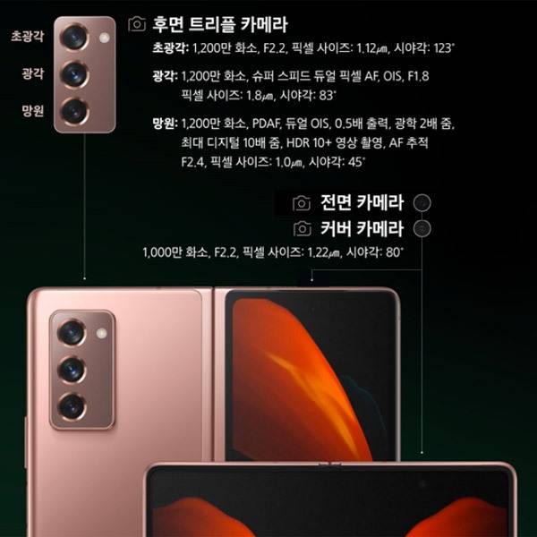 갤럭시 Z 폴드2는 폰을 접었을 때나 펼쳤을 때 언제든지 사진이나 영상으로 순간을 기록할 수 있도록 총 5개의 카메라를 탑재했다.