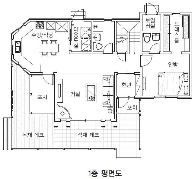 현관을 지나 실내로 들어서면 2층으로 올라가는 계단이 정면으로 마주한다. 이 계단을 기준으로 좌측에 거실과 주방/식당, 공용 욕실이, 우측에 드레스룸과 전용 욕실을 둔 안방이 있다. 거실과 주방/식당은 공간을 구분하면서, 또 시선이 교차하는 대각선 구조로 계획했다.
