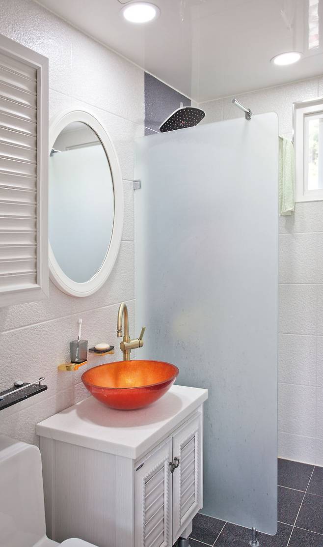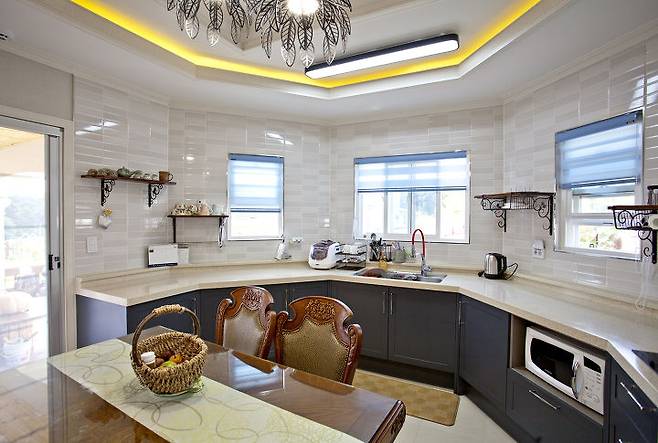 주방/식당은 팔각 모양으로 지중해풍 스타일에다 편리한 동선을 모두 담아냈다. 이곳에서 보조 주방을 통해 뒤편으로, 식당을 통해 야외 테이블이 놓인 데크로 이동할 수 있다. 주방엔 하부장만으로도 수납공간이 충분하기에 상부장 대신 조망을 위한 창을 내고, 야자 나뭇잎 모양의 등으로 포인트를 줬다.