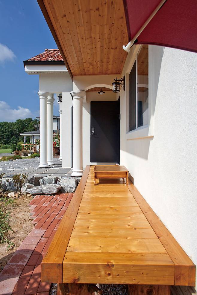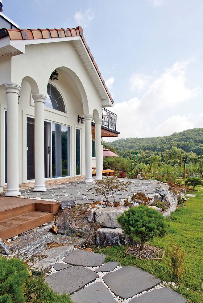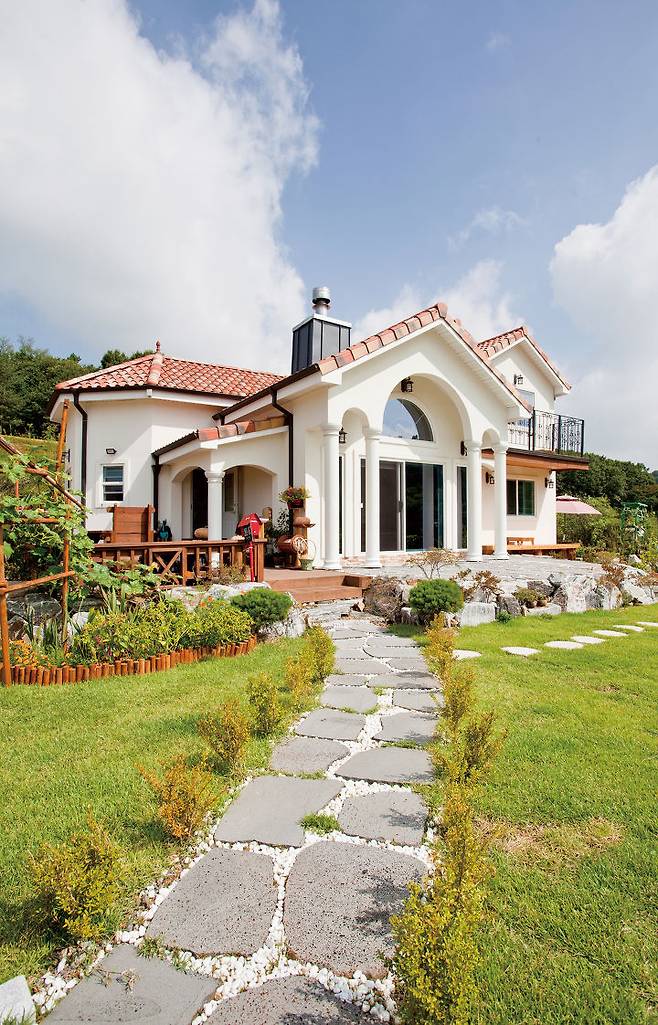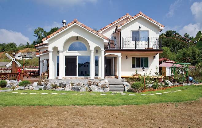 동탄 신도시에서 23번 국도를 타고 20여 분 달리면 작은 산들로 둘러싸인 통삼리에 다다른다. 산을 배경으로 통삼저수지 쪽으로 향이 열린 이곳 아담한 전원주택단지엔 예쁜 풍차가 눈길을 끄는 주택이 있다. 거실의 개구부를 아치 형태로 꾸미고, 전면에 처마를 받치기 위해 만든 로마 신전을 떠올리게 하는 기둥도 특이하다. 건축주 부부가 힐링을 위해 지은 지중해풍의 주택이다.