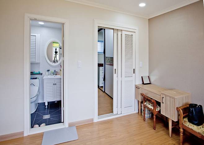 백색과 아이보리 색의 실크벽지와 강마루로 마감한 안방은 후면에 전용 욕실과 드레스룸이 있다. 드레스룸은 3연동 문으로 공간을 구획해 공간 활용도가 높다.