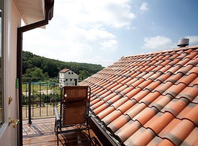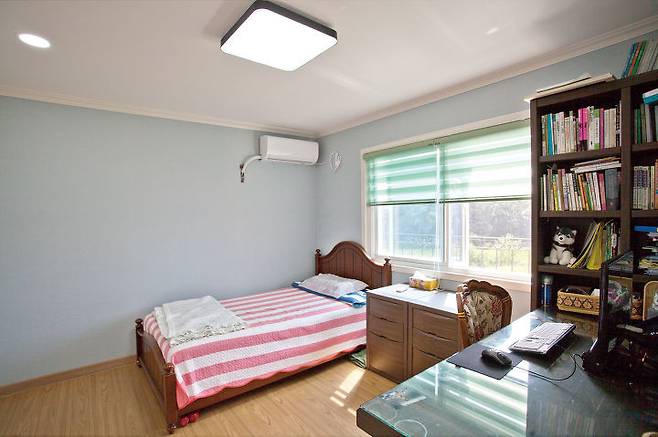현관 전면에 있는 계단을 통해 2층으로 올라가면 마당과 함께 주변 경치를 바라볼 수 있는 작은 베란다와 작은아들이 귀국하면 지낼 욕실이 딸린 방이 있다.