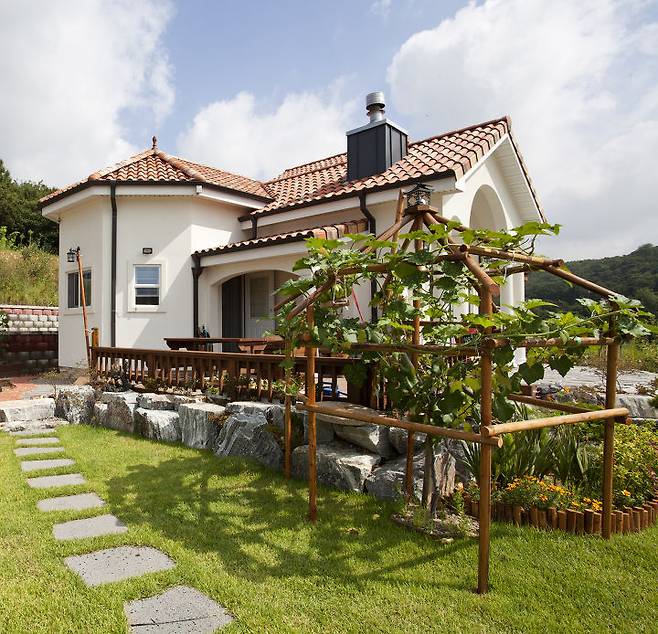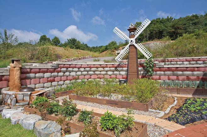 정화조의 환기구를 풍차로 바꾸고, 그 앞에 아담한 정원과 텃밭, 그리고 황토로 만든 화덕이 신선하게 다가온다. 그 앞으로 포도나무와 호박이 잘 자라도록 만든 지지대가 아늑한 등나무처럼 느껴진다. 지금은 그네 만들기에 한창인 남편이 모두 만든 것으로, 음식을 만들던 손이 목수의 손으로 변신했다고 할까.