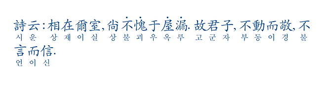 주위에 사람이 없다고 느슨하고 지나치게 편하게 생활하면 밖에 나가서도 실수를 할 수 있다고 보았기 때문이다. 우리 속담에도 이와 관련해서 “안에서 새는 바가지 밖에서도 샌다”는 말이 있다. 평소 주의하고 조심하지 않으면 바람직하지 않은 행동과 처신이 은연중에 나타나는 것을 경계하는 말이다.
