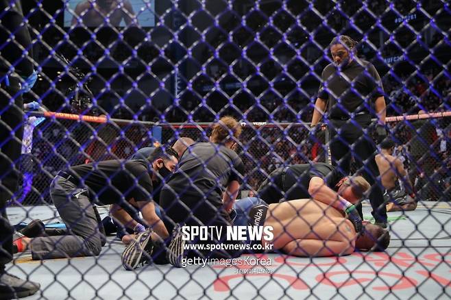 7년 5개월이 지났다. 옥타곤 위에서 똑같은 아찔한 사고가 일어났다. 운명의 장난처럼 로킥을 차다가 정강이가 부러진 이번 부상자는, 다름 아닌 와이드먼이었다.