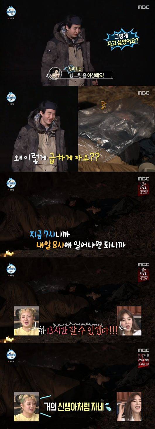 헨리는 "지금 저녁 7시고, 내일 아침 8시에 일어나야 하니까 13시간 잘 수 있겠다"라며 어이없어했다. 이를 듣던 박나래는 "그정도면 신생아 아니냐"며 폭소했다. 걱정과 달리 기안84와 헨리는 바로 잠들었다. 헨리는 "추워서 잠이 잘왔다. 인생 신기록이다. 8시에 취침에 성공했다"고 말했다.