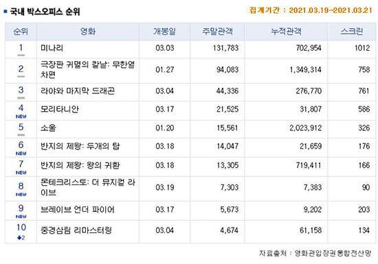 지난주 올해 첫 200만 영화로 이름 올렸던 < 소울>은 순위 변동 없이 5위에 머물렀다. 주말에 1만 5천 명을 더해 누적 관객 2,023,912명을 기록했다.