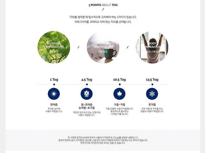 예를 들어 영국의 한 이불 브랜드는 '토그(Tog)' 단위로 보온성을 측정한다. 토그는 영국 섬유산업에서 사용하는 온도 측정 단위로 소비자들이 계절에 맞는 이불을 선택할 수 있게 돕는다. 토그 단위가 높아지면 더 따뜻한 것을 의미한다. 또 토그가 같은 제품을 구매했다면 소재, 두께 무게의 차이가 있어도 따뜻한 정도는 동일하다는 의미다. 두껍다고 무조건 따뜻한 것은 아니란 이야기다.