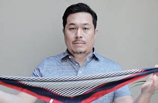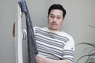 1. 스카프의 중간을 한 번 접어서 흰색과 남색 줄무늬가 겹치게 해주세요.