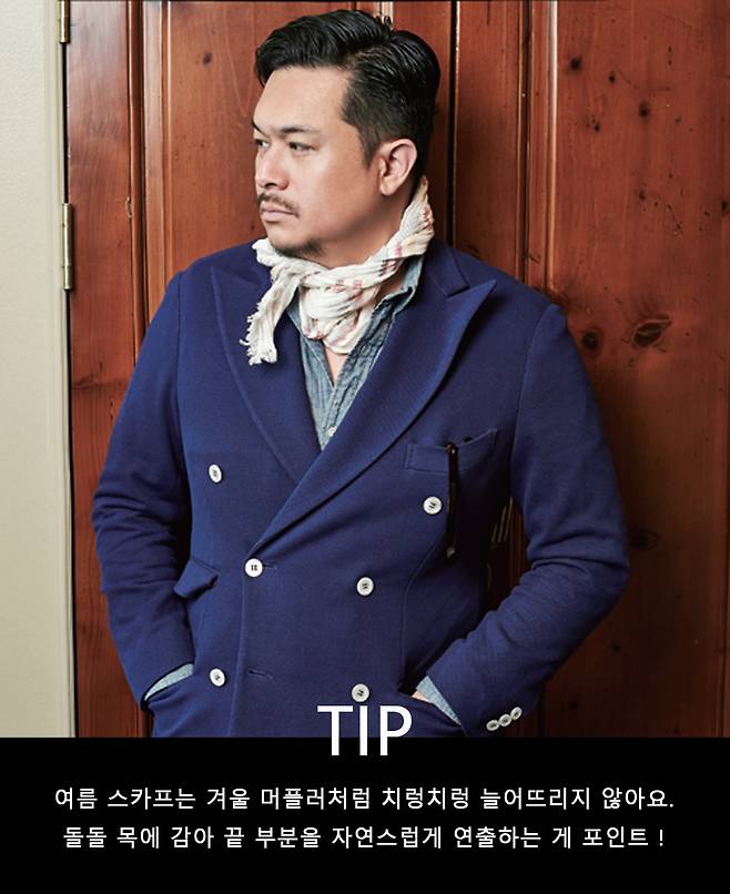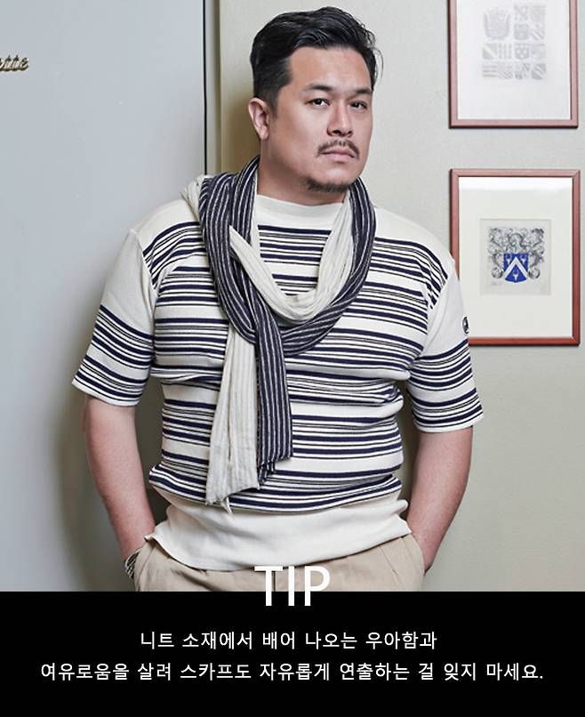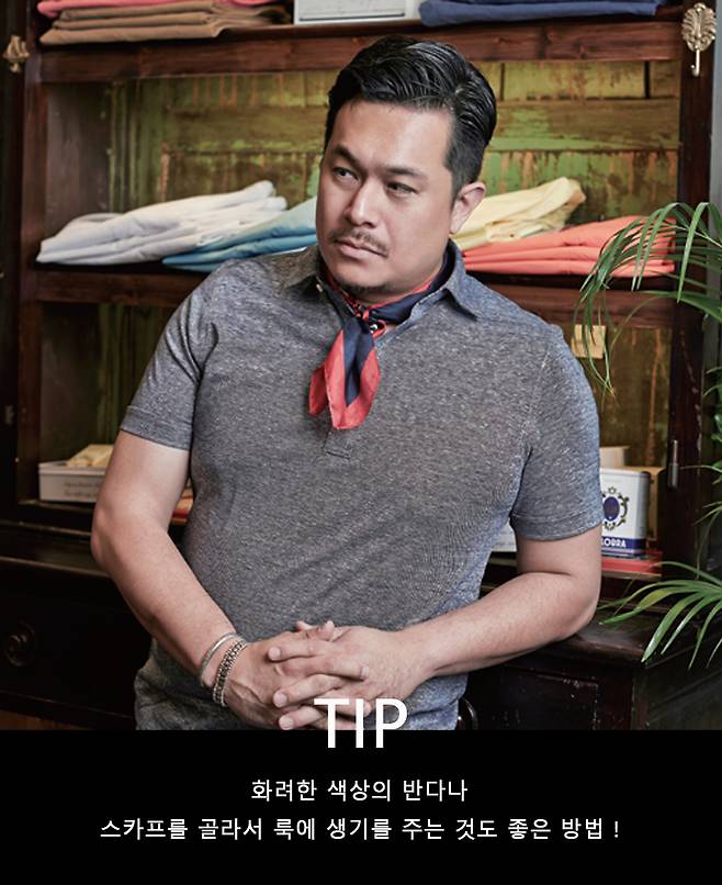 5. 또는 스카프를 폴로 티셔츠 안으로 넣어 단정하게 연출할 수도 있어요.
