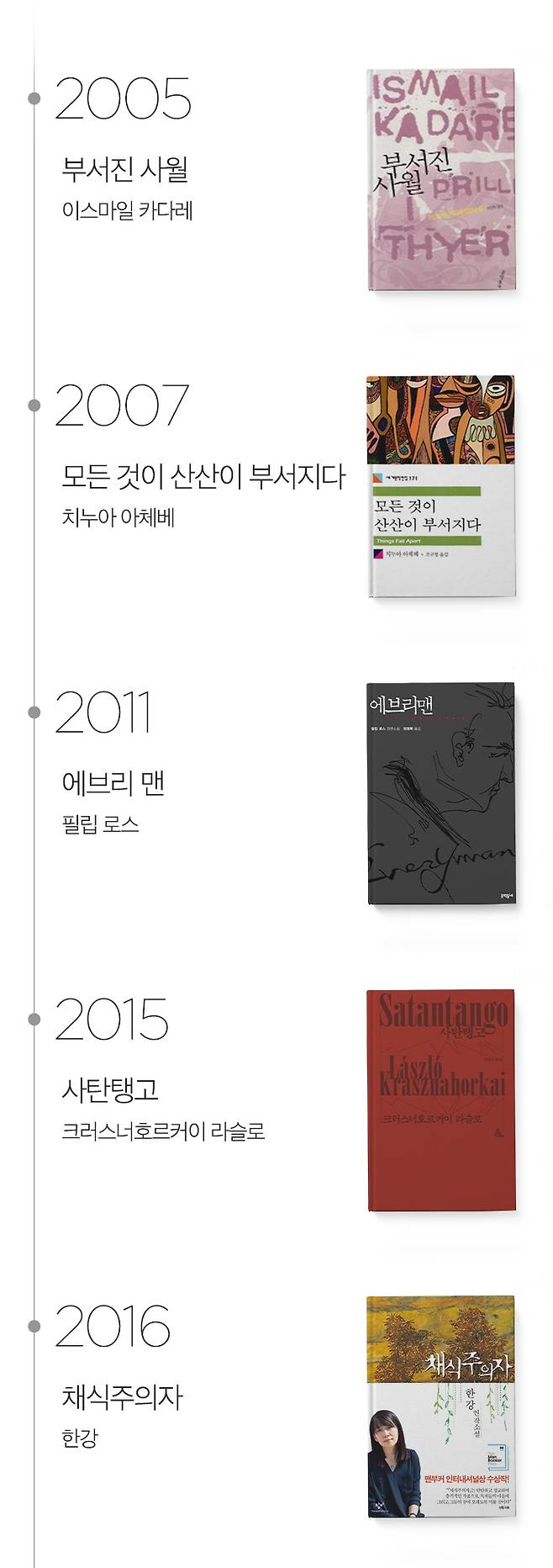 대표 수상자로 2005년 이스마일 카다레 <부서진 사월>, 2007년 치누아 아체베 <모든 것이 산산이 부서지다>, 2011년 필립 로스 <에브리 맨>, 2015년 크러스너호르커이 라슬로 <사탄탱고>, 2016년 한강 <채식주의자> 등이 있습니다. 크러스너호르커이 라슬로의 <사탄탱고>의 경우 7시간이 넘는 동명의 영화가 존재합니다. 책 읽기가 오래 걸리고 힘들어서 영화로 보는 사람들에게는 선택이 쉽지 않겠네요.
