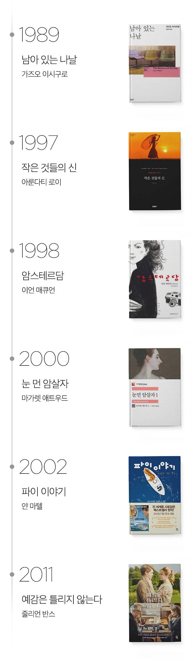 대표적으로 1989년 가즈오 이시구로 <남아 있는 나날>, 1997년 아룬다티 로이 <작은 것들의 신>, 1998년 이언 매큐언 <암스테르담>, 2000년 마가렛 애트우드 <눈 먼 암살자>, 2002년 얀 마텔 <파이 이야기>, 2011년 줄리언 반스 <예감은 틀리지 않는다> 등이 있습니다. 노벨 문학상 수상자와도 많이 겹치네요.